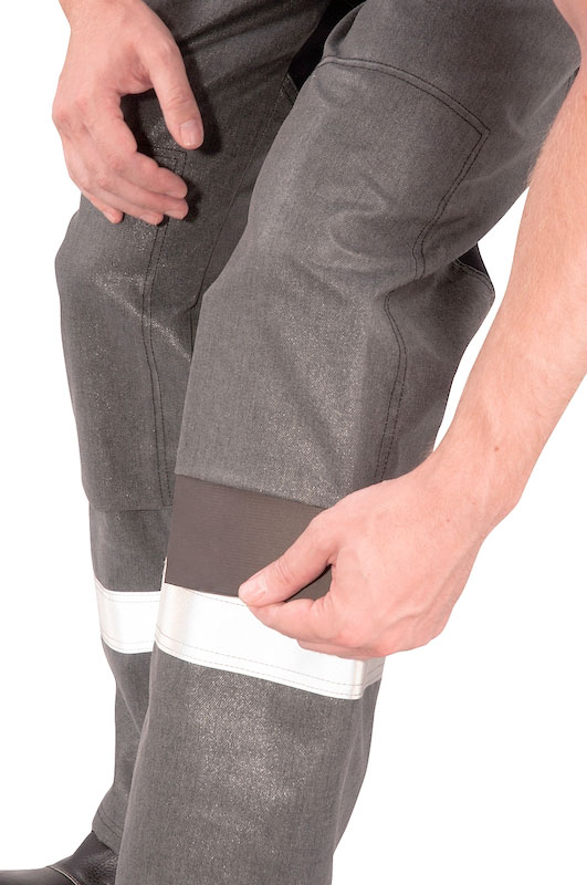 Накладки полочек куртки, рукавов, передних половинок брюк, низа задних половинок брюк из ткани производства Адвентум Технолоджис, состоящей из смеси термостойких волокон и отделанной силиконизированным покрытием.