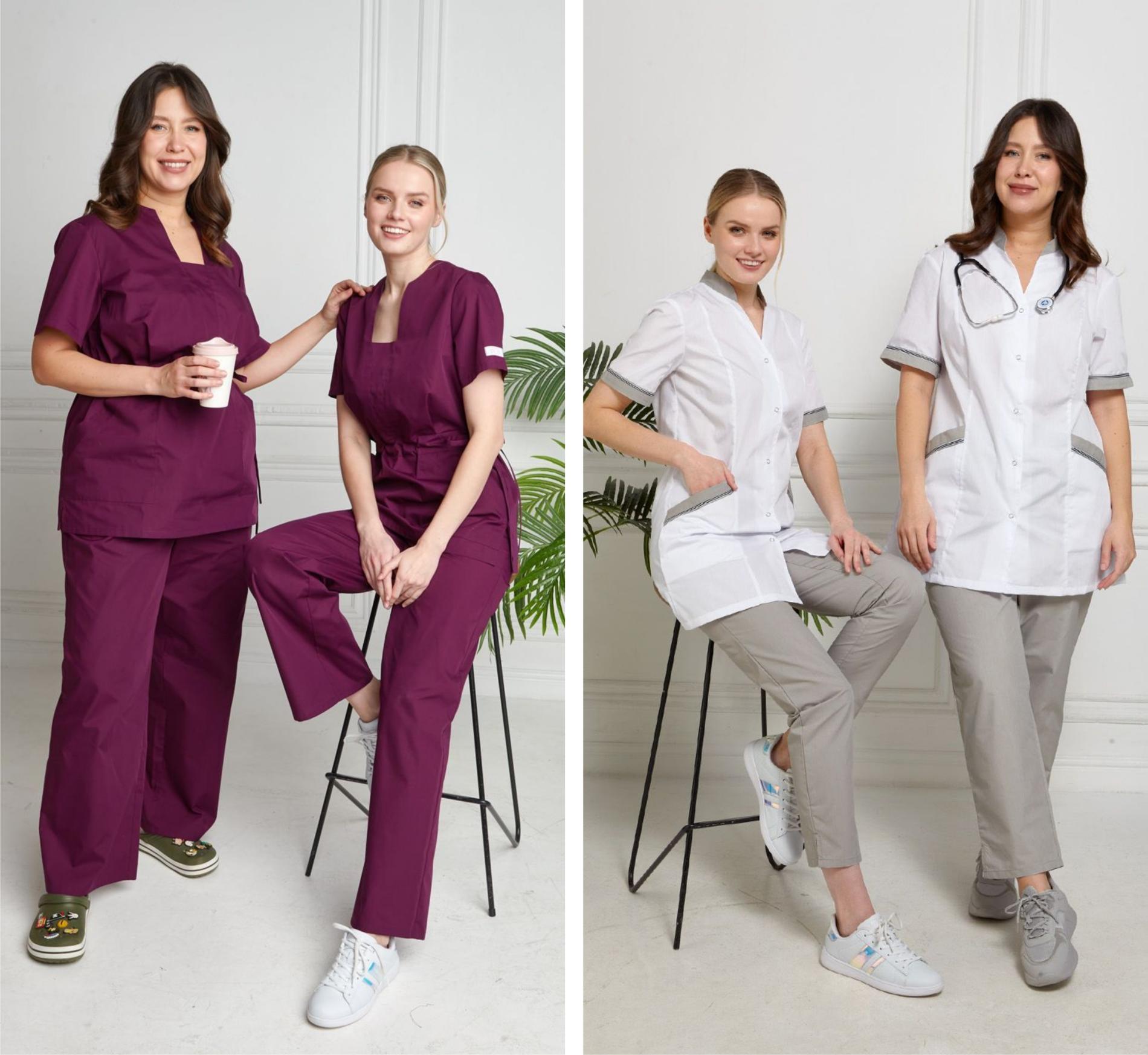 На фото: женские модели для медицины, HoReCa и сферы услуг – комплекты «Тильда», комплекты «Луксор».