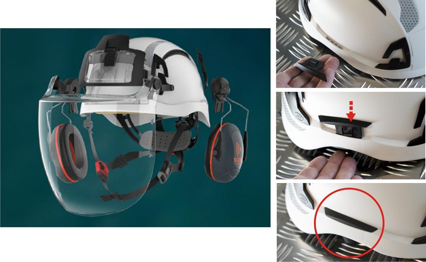 Точки крепления на корпусе шлема обеспечивают надежную установку защитных наушников, лицевых щитков, очков для защиты глаз и фонарей, пелерины а также ряда других специальных аксессуаров.