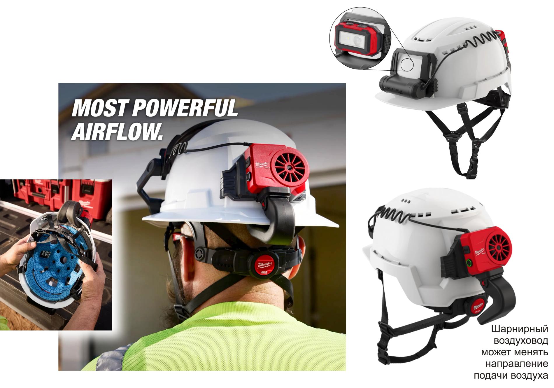 Охлаждающий вентилятор BOLT™ REDLITHIUM™ USB надёжно крепится к переднему и заднему монтажным гнёздам касок серии BOLT™.