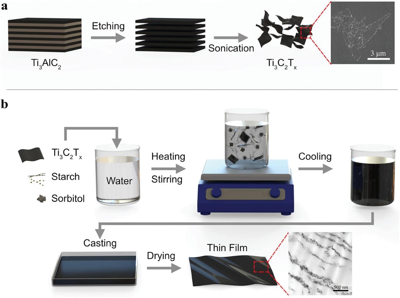 Процесс получения нанокомпозитных пленок из крахмала и максена. © Ming Dong et al.