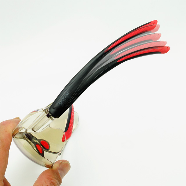 Дужки выполнены по технологии двухкомпонентного литья (вставки красного цвета мягкие и гибкие). И, наконец, у очков есть вставка для корригирующих линз.