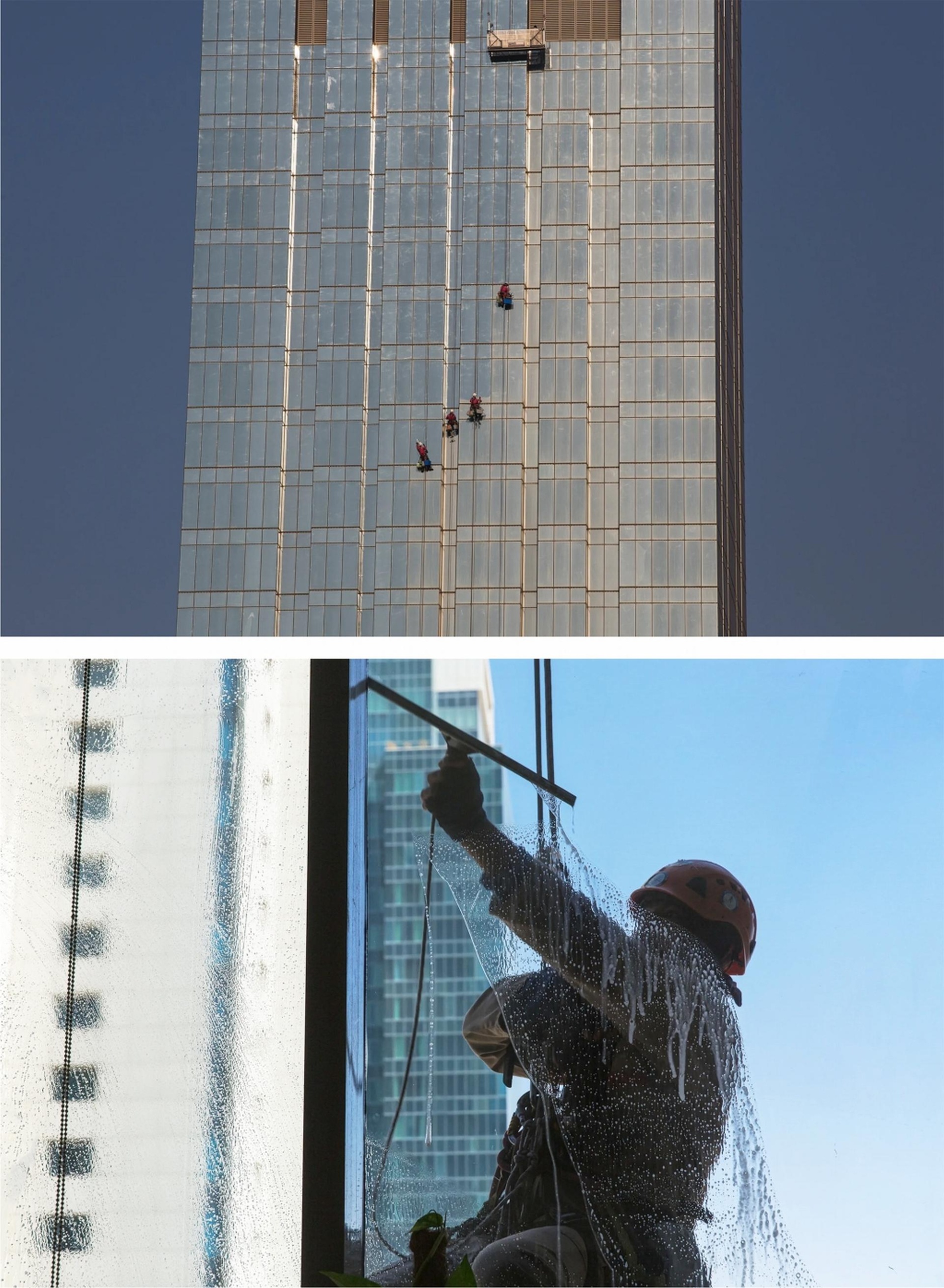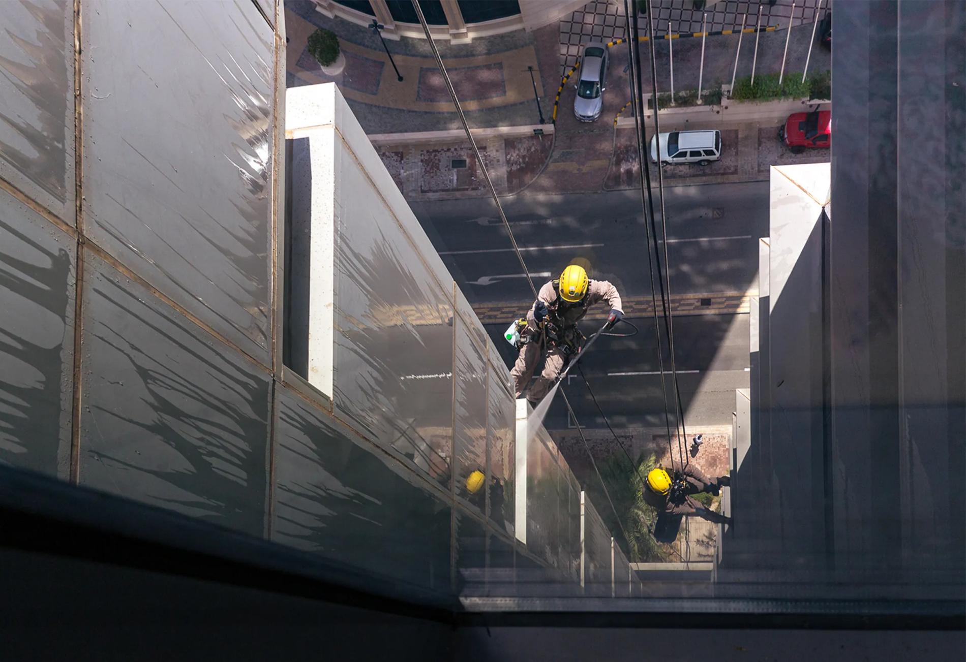 На фото: мойка фасадов в Дохе (Катар). Высота, яркий свет, испепеляющее солнце – с одной стороны; требование к аккуратности и безупречности – с другой.