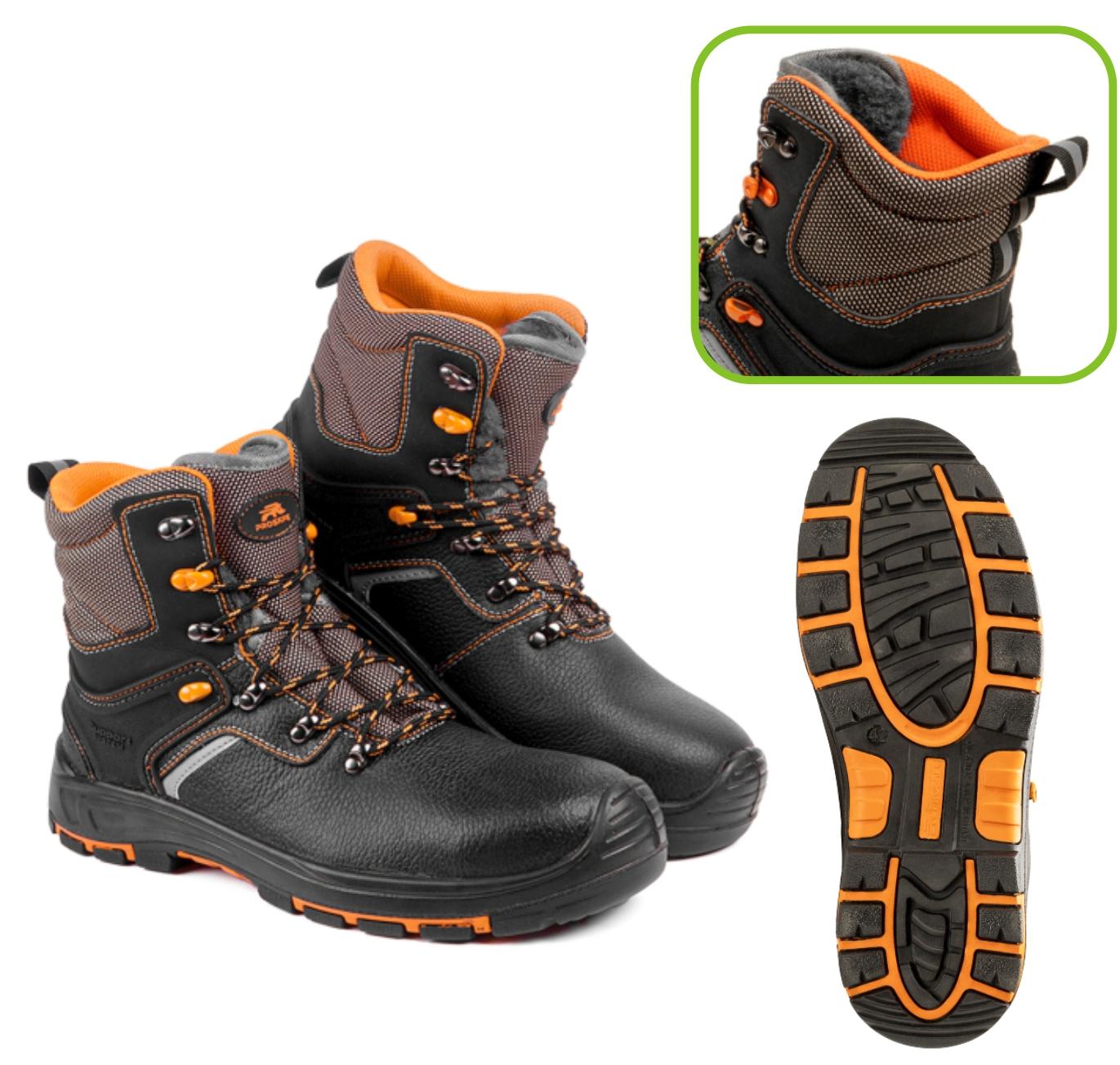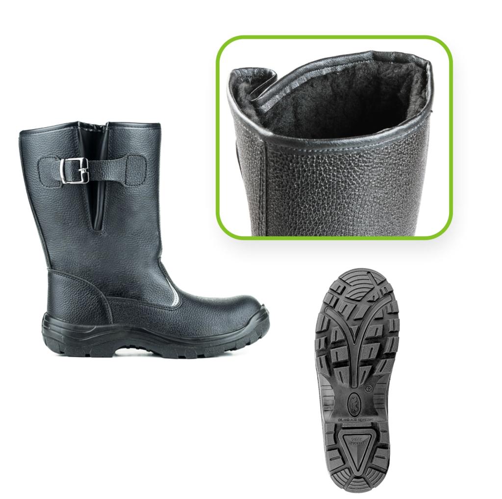 Модель оснащена металлическим подноском (200 Дж) – простым и надёжным решением для защиты пальцев при выполнении стандартных производственных работ. Рельефный протектор снижает риск скольжения, а съёмная меховая стелька обеспечивает дополнительное тепло и удобство.