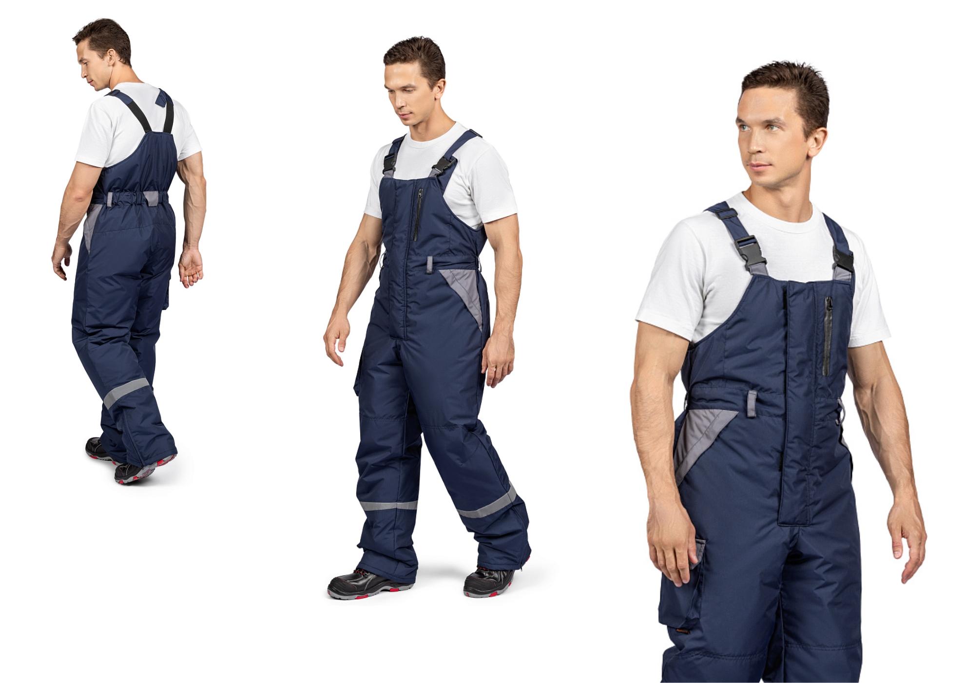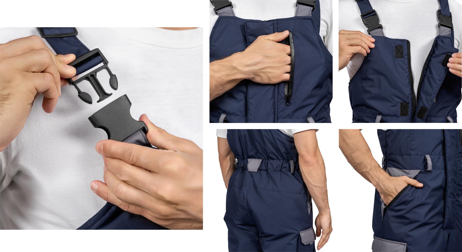 Полукомбинезон выполнен из той же тёмно-синей основной ткани с серыми деталями, что позволяет комбинировать его с курткой в единый комплект.