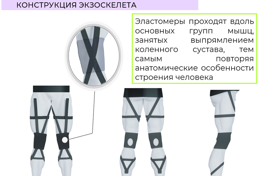 Брюки состоят из системы эластичных лямок, проходящих вдоль основных мышц ног. Когда человек сгибает ноги, эластомеры натягиваются, накапливая потенциальную энергию, при разгибании она высвобождается, снижая нагрузку на мышцы.
