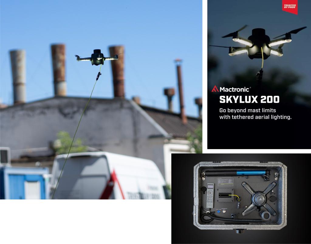 Компания удивила новинкой – специализированным квадрокоптером Skylux 200, способным взмывать на заданную высоту и освещать территорию. Дрон имеет страховочный трос для постановки на якорь на земле, что обеспечивает «привязку» к точке, особенно при порывах ветра.