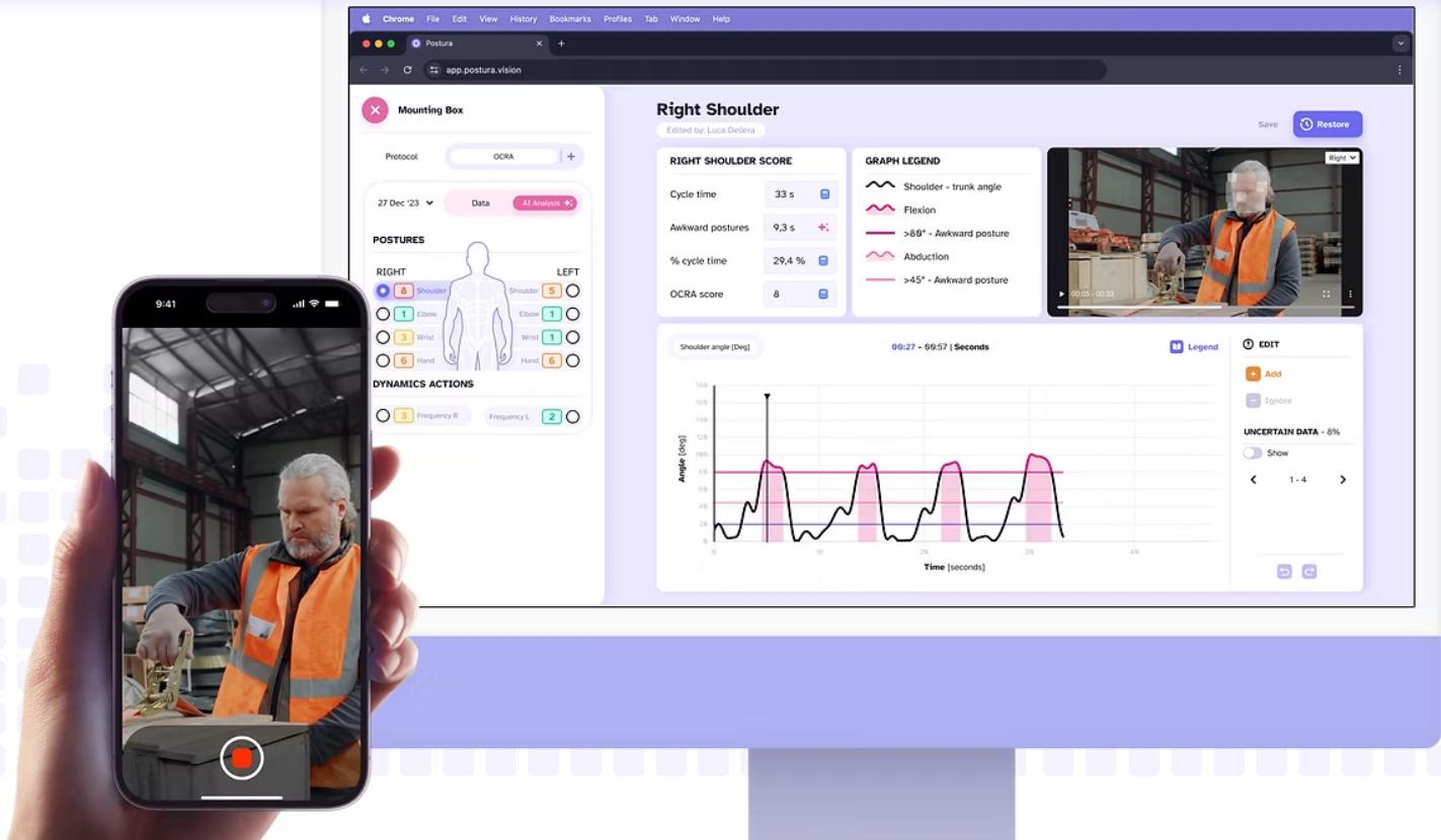 Ещё один итальянский стартап Postura – это операционная система на базе искусственного интеллекта для оценки состояния и управления движением человека в промышленных условиях, в которую эргономисты, менеджеры по охране труда и технике безопасности и инженеры-технологи могут в реальном времени вносить изменения, улучшающие эргономику и исключающие опасные нагрузки.